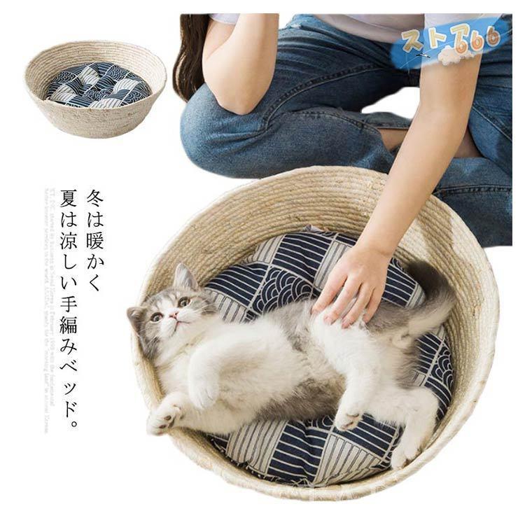 猫 ベッド 天然素材 ペットベッド 手編み クッション付き マット 小型